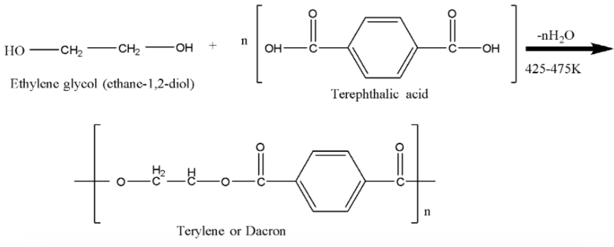 Terylene is manufactured by the condensation of ethylene glycol and Terephthalic acid (1,4-benzene dicarboxylic acid) with removal of water in this zinc acetate and antimony trioxide mixture is used as catalyst. The temperature required for this process is 151.85-degree Celsius to 201.85-degree Celsius. In polymerization many monomers react together and form polymers. Terylene is also known as Dacron.