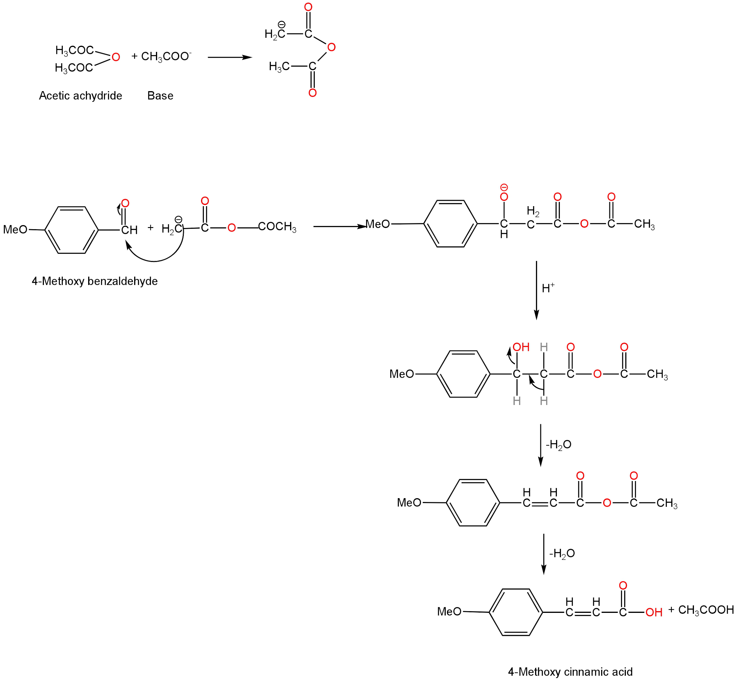 This reaction's mechanism contains the reaction of aromatic aldehydes with the aliphatic acid anhydride in the presence of the alkali salt of the acid to give cinnamic acid derivatives.