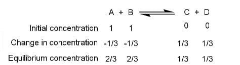 The initial concentrations of the reactants A and B are taken as 1M. It is given that at equilibrium, one-third of A and B are consumed.