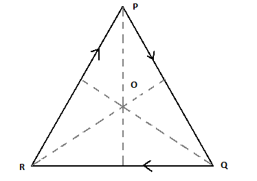 The current $I$ is flowing in an equilateral triangle of side $a$ as shown in figure. The magnetic field at the centroid $O$ will be: