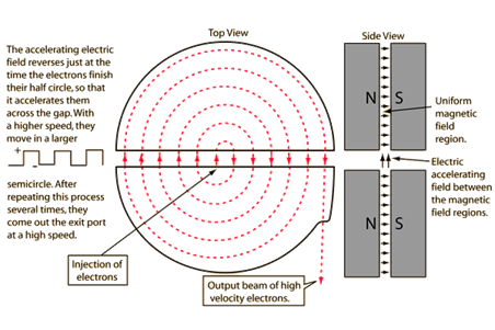 Note: The cyclotron frequency mainly depends upon the specific charge and the magnetic induction. The specific charge is calculated by dividing the charge of the particle and the mass of it. The use of the cyclotron is to produce the radioactive isotopes which are used in the process of the imaging procedures.