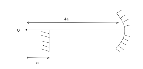 Two conditions are given for this problem. First, the object is kept at O, i.e. a distance $4a$ from the concave mirror. Second, the final image after reflection from the plane mirror forms at O i.e. at a distance of $a$ behind the plane mirror.