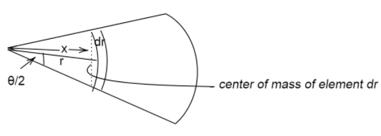 $\Rightarrow {x_{center{\text{ }}of{\text{ }}mass}}$ =$\dfrac{{2\sin \dfrac{\theta }{2}\int\limits_0^R {{r^2}dr} }}{{\theta \int\limits_0^R {rdr} }}$