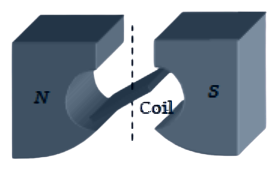 The figure below shows the north and south poles of a permanent magnet in which n turn coil of area of cross-section A is resting, such that for a current i passed through the coil, the plane of the coil makes an angle θ with respect to the direction of magnetic field B . If the plane of the magnetic field and the coil are horizontal and vertical respectively, the torque on the coil will be