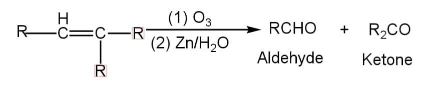 The ozone molecule is added to the double bond of $RCH=C{{R}_{2}}$ in the ozonolysis reaction and forms an ozonide. Ozone (${{O}_{3}}$), a powerful oxidant, may easily transform alkenes into carbonyl compounds. Both the sigma and pi bonds are broken in this reaction. In the presence of $Zn/{{H}_{2}}O$, hydrolysis of the synthesised ozonide occurs.
