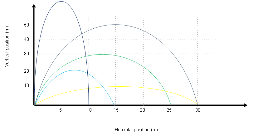 The following graphs show the horizontal position versus the vertical position for different projectiles based on the colours of the projectiles (air resistance negligible). All projectiles are launched from the same horizontal surface, under the same conditions.