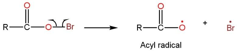 Now the bond between Br and O (RCOOBr) is not stable or weak. So it undergoes homolytic cleavage (bond electron divided equally because of less electronegativity difference between both elements) to give out two radicals such as