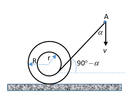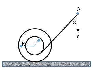 The free end of a thread wound on a bobbin of inner radius \[r\] and outer radius \[R\] is passed around a nail A hammered into a wall as shown in the figure. The thread is pulled at a constant velocity \[v\]. Find the velocity \[{v_0}\] of the bobbin instant when the thread from an angle \[\alpha \] with the vertical, assuming that the bobbin rolls over the horizontal surface without slipping.