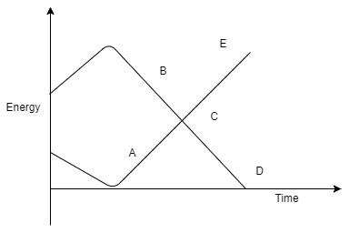 Thus, at a point C in the graph we can see where the potential energy curve and the kinetic energy curve intersects to meet at the point C. We get to see from the graph that the kinetic and potential energy become just the same to each other.