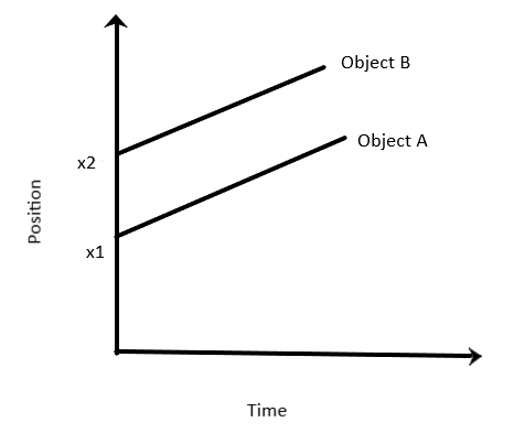 We know that the slope of the position – time graph is velocity. In this question the position-time graph of two objects is given. The graph is a straight line with a positive slope. The graph of both objects is a straight line parallel to each other. We know that slope is the same for parallel lines. That is, velocity of A and B are equal and in the same direction.