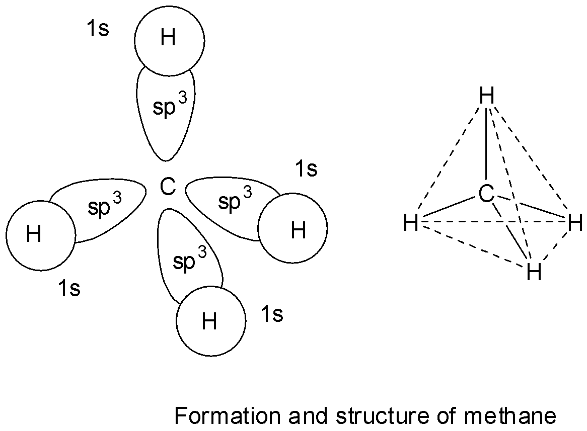 In methane, carbon has 4 valence electrons and takes 4 more electrons to complete its octet. The four half filled orbitals of carbon in methane before getting involved in bond formation, mix up their energies and rearrange and redistribute equally to give four new and equivalent ${\text{s}}{{\text{p}}^3}$ hybrid orbitals which are directed at an angle of ${109^\circ }28'$ with respect to one another. These 4 ${\text{s}}{{\text{p}}^3}$ hybrid orbitals of carbon then overlap with 1s orbitals of 4 hydrogen atoms to give four ${\text{s - s}}{{\text{p}}^3}$ sigma bonds. The four bonds in methane are directed towards the 4 corners of a tetrahedron.