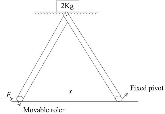 The machine as shown has $2$ rods of length $1m$ connected by a pivot at the top. The end of one rod is connected to the floor by a stationary pivot and the end of the other rod has a roller that rolls along the floor in a slot. As the roller goes back and forth, a $2kg$ weight moves up and down. If the roller is moving towards right at a constant speed, the weight moves up with a: