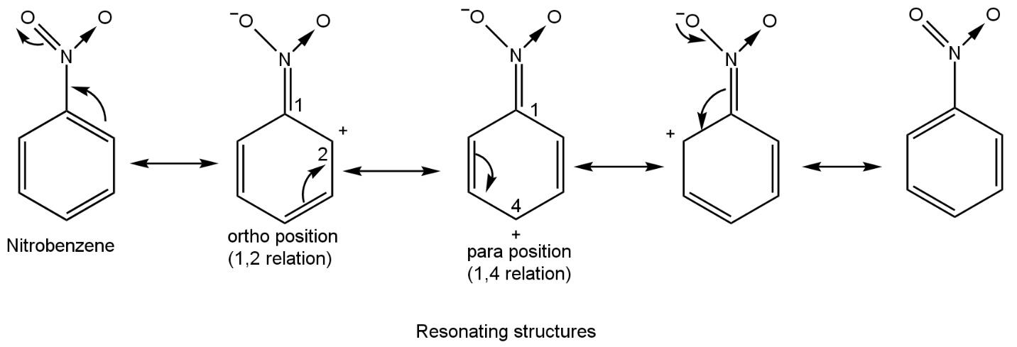 Note: After nitration of benzene, HNO2 group is attached directly to the ring. As nitrogen is attached to the benzene ring and also directly attached to the oxygen atom, this group will behave as an electron withdrawing group and attract the whole electron density of the ring towards itself.