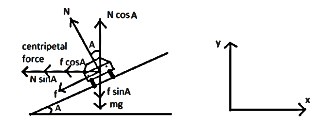 Note: Roads are banked to stop fast cars from skidding. If a car is moving faster than the aforementioned speed, it will slide. If there is inadequate frictional force, the car will slide. Additionally, keep in mind that while the car tries to slide along the road, friction acts downwardly along the surface.