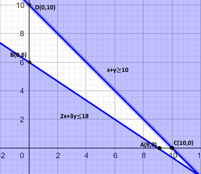 \[Z = 4x + 2y\] subject to constraints \[2x + 3y \leqslant 18\] and \[x + y \geqslant 10\] where \[x \geqslant 0\] and \[y \geqslant 0\]