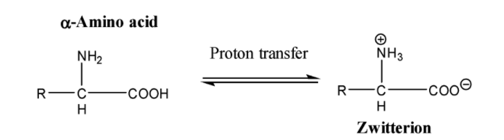 -They exist as internal salt or zwitterion: Since amino acids contain both an acidic group (carboxyl group) and a basic group (amino group), they neutralise each other through the transfer of a proton from the carboxyl group to the amino group present in the molecule. The resultant ion is called a dipolar ion.