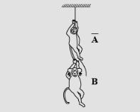 The monkey B shown in figure above is holding on to the tail of the monkey A who is climbing up an ideal rope. The masses of the monkeys A and B are 5 kg and 2 Kg respectively. If A can tolerate a tension of 30 N in its tail, what force should it apply on the rope in order to carry the monkey B with it? Take g = $10m/{s^2}$.