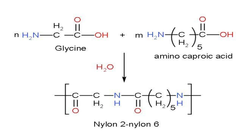 There are two monomers of Nylon 2-nylon 6 named as Glycine $\left( \text{Gly} \right)$ with chemical formula $\left( {{\text{H}}_{2}}\text{NC}{{\text{H}}_{2}}\text{COOH} \right)$ and Amino caproic acid has the chemical formula $\left( {{\text{C}}_{6}}{{\text{H}}_{13}}{{\text{O}}_{2}}\text{N} \right)$. The reaction of both gives the polymer nylon 2-nylon 6 after removal of water molecules from the reactants.
