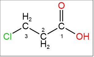 The structure of the compound is $ClCH_2CH_2COOH$ the chlorine is attached to the third carbon because the numbering starts from the carboxylic acid carbon. The name of the compound is 3-chloropropanoic acid.