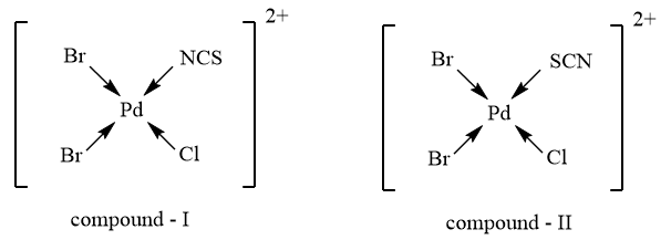Therefore, the total number of possible isomers for ${{K}_{2}}\left[ PdClB{{r}_{2}}\left( SCN \right) \right]$ is $4$.