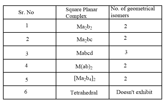 For square planar complexes, the number of geometrical isomers is summarized in the following table: