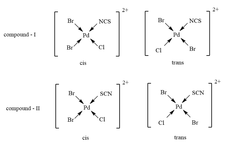 Note: It is important to note that the square planar complexes do not show optical isomerism due to the presence of a plane of symmetry. Also, the important point to remember is that the cis isomers are identical to the linkage isomers, so the total number of isomers is 4 instead of 6.