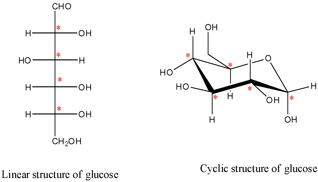 Note: Linear structure of molecules is for our understanding purpose only, originally glucose exists in cyclic structures only with five chiral or stereo centers. The number of optically active isomers is also high for cyclic glucose structure when compared to linear structure of glucose.