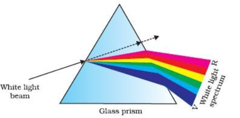 Dispersion is the phenomenon in which the white light when passed through a glass prism splits into its spectrum of colours. This phenomenon along with refraction is responsible for the formation of rainbows in the sky.