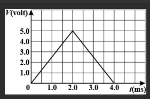 The potential difference across a $150 \mathrm{mH}$ inductor as a function of time is shown in figure. Assume that the initial value of the current in the inductor is zero. What is the current when $t=4.0 \mathrm{ms} ?$