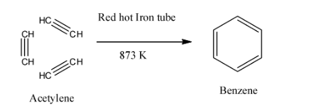 - Pass the three molecules of ethyne through the red hot Fe tube at 873K. All the three molecules of ethyne undergo cyclic polymerization to form benzene. We can also say that all the three molecules of ethyne undergo condensation or trimerization to form benzene. This method is also called polymerization.