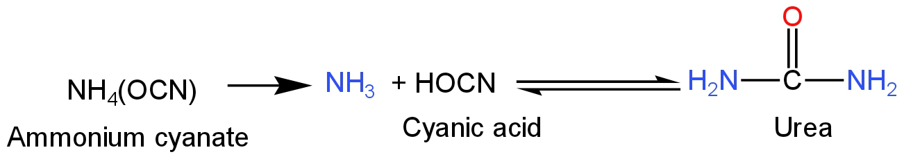 Additional Information: The Wöhler synthesis is the transformation of ammonium cyanate into urea. This chemical reaction was depicted in 1828 by Friedrich Wohler. It is frequently referred to as the beginning step of modern organic chemistry. Around 1780 chemists began to differentiate between organic compounds collected from