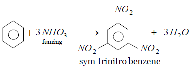 Water is a polar solvent which activates the benzene ring so much that on treatment with nitric acid in water the electrophile or the nitro group attacks the ortho, meta and one para positions at a time and gives sym-trinitrobenzene as a major product along with three moles of water.