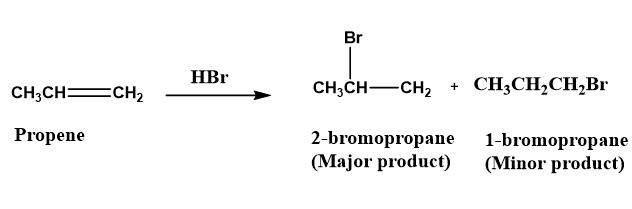 Propene readily reacts with \[HBr\]and forms 2-bromopropane (major product) and 1-bromopropane (minor product).