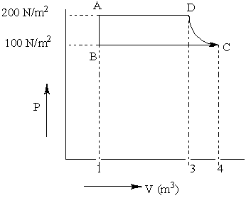 The Given diagram represents the adiabatic process of an ideal gas. From the graph, \[{p_i}\]is 100 N/m2 and \[{p_f}\]is 200 N/m2 . And \[{v_f}\]is 3 and \[{v_i}\]is 4 and \[\gamma \]is 1.4.