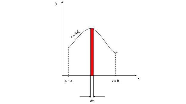 In the above figure the area under the entire curve can be found by calculating the area of the rectangle which is painted red and integrating it between the limits a to b. The area of the rectangle (dA) is equal to the product of height (y = f(x)) and width (dx).