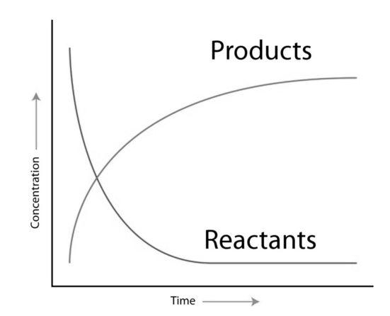 When the reaction begins, the concentration of reactants is high i.e. a large number of reactant molecules are available for conversion to product. So, the reaction begins faster. But as the reaction proceeds, concentration of the reactant goes on decreasing as more and more of it gets converted to product. So, the concentration of product increases. Eventually as there is less and less reactant available for conversion, the reaction slows down. At a point, there is no reactant left to convert to product. So, the reaction will stop.