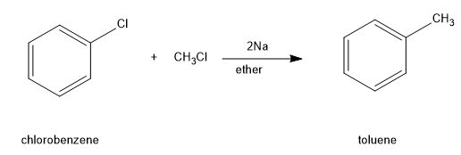 Image: reaction of an aromatic halogen (chlorobenzene) with alkyl halide (chloromethane) in presence of sodium and ether.