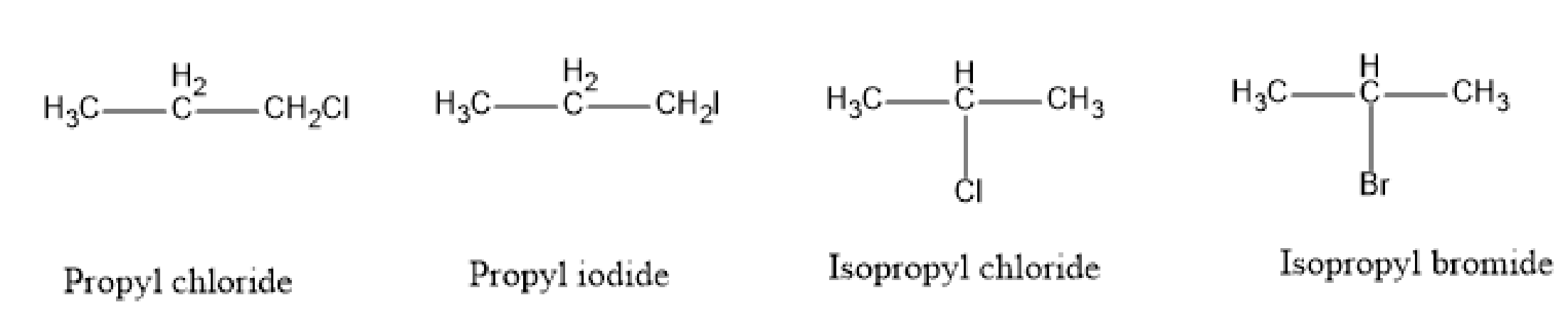 Here, four alkyl halides are given whose names are propyl iodide, propyl chloride, isopropyl bromide and isopropyl bromide. Let's draw the structures of these alkyl halides.