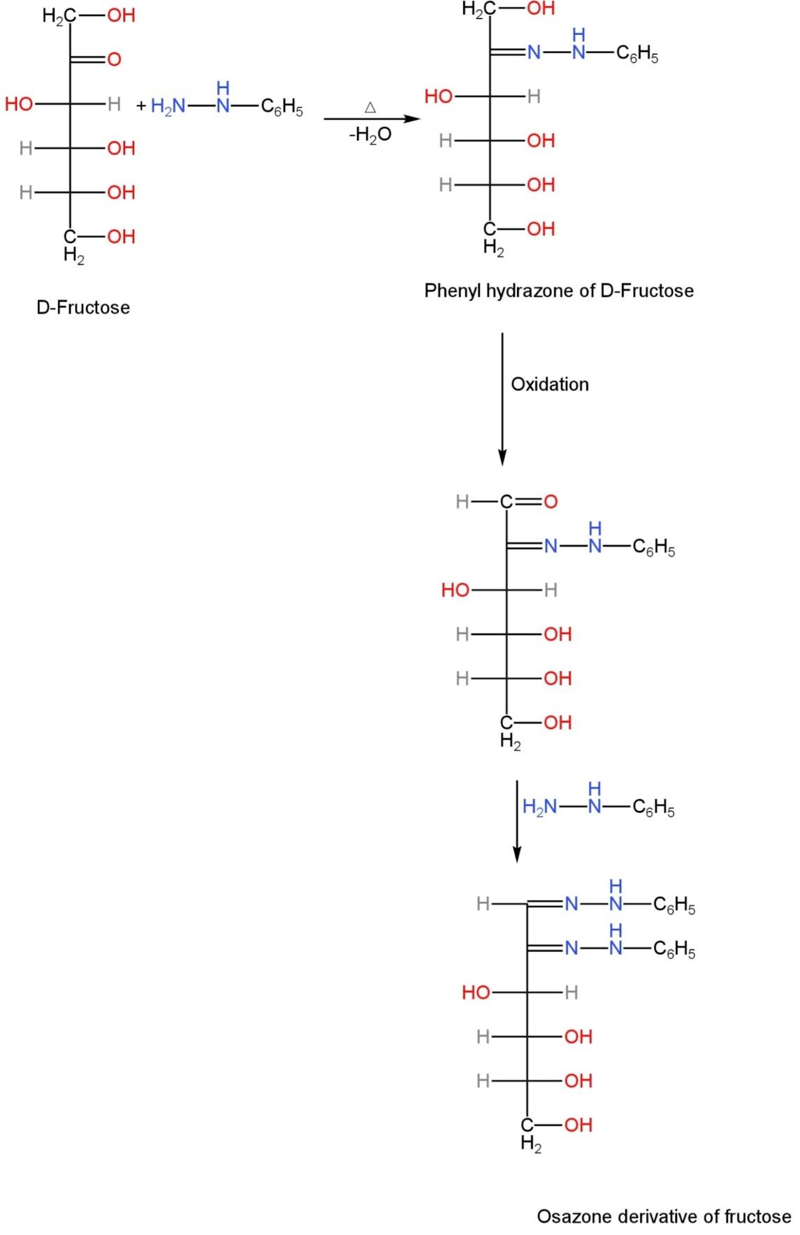 Image: Mechanism of conversion of fructose into its osazone derivative.