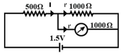 Let I be the total current flowing in the circuit which subsequently gets divided into I’ flows through both the resistance of 1000 ohm and the voltmeter, as shown in the following figure.