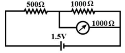 As the voltmeter and the resistance of 1000 ohm are in parallel and both of them have a resistance of equal magnitude, so the current will be equally distributed among them. Hence, we can say that,