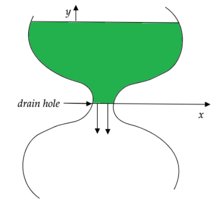 The shape of an ancient water clock jug is such that water level descends at a constant rate at all times. If the water level falls by \[4cm\] every hour, determine the shape of the jar, i.e., specify \[x\] as a function of \[y\] . The radius of the drain hole is \[2mm\] and can be assumed to be very small compared to \[x\] .