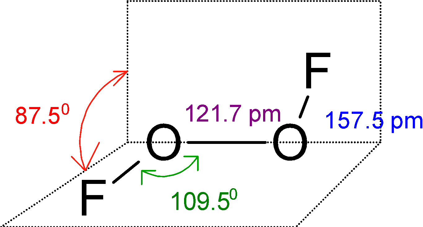 The ${{\text{O}}_{\text{2}}}{{\text{F}}_{\text{2}}}$has a large dihedral angle that approaches $\text{9}{{\text{0}}^{\text{0}}}\text{C}$ and has ${{\text{C}}_{\text{2}}}$ an axis of symmetry.