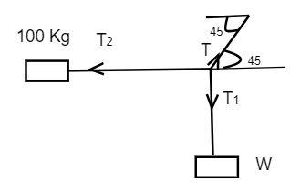 ${T_1} = W = T\sin {45^ \circ }$ …………………………(1)