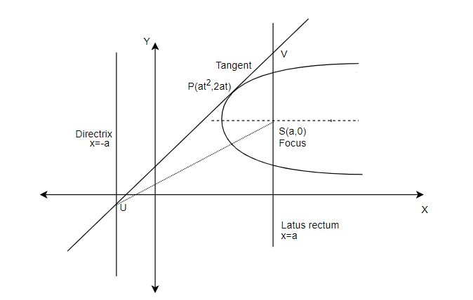 In the question, the equation of the parabola is given as ${{y}^{2}}=4ax$. The tangent at a point $P$ is said to meet the directrix at point $U$ and the base of latus rectum at $V$.