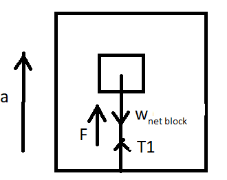 By balancing the forces we get, ${T_1}$ is the tension in the string when the system is being accelerated. ${w_{netblock}}$is the weight of the block while the system is being accelerated.