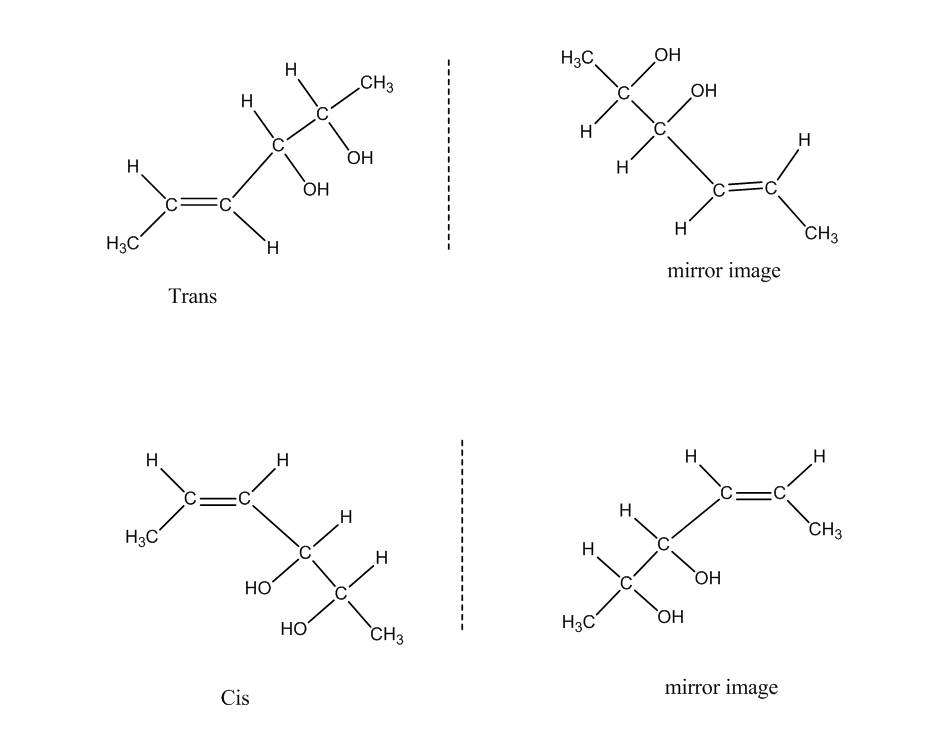 Now there are two forms called Trans and Cis they have mirror images also. So, the geometrical isomers formed are four.