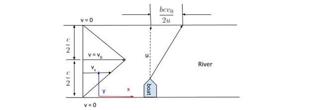 The speed of the boat is u m/s, speed of the river stream rises proportional to its distance from the bank and is maximum at the centre of the river and it has a value of $v_0$ m/s.