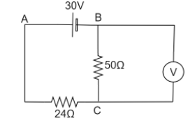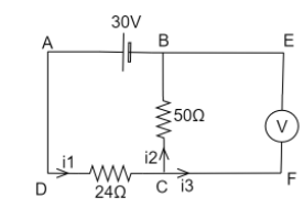 In the given circuit, we have the voltmeter connected in parallel with the $50\Omega $ resistor. The current originates from the positive terminal of the $30\;V$ battery and divides into two streams at the point $C$. The division of current can be determined by Kirchhoff’s current law or Kirchhoff’s junction law. Which states that at a junction, the total amount of current entering must be equal to the total amount of current leaving it.