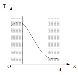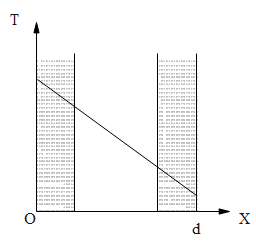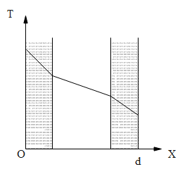 The wall with a cavity consists of two layers of brick separated by a layer of air. All three layers have the same thickness and the thermal conductivity of the brick is much greater than that of air. The left layer is at a higher temperature than the right layer and steady state condition exists. Which of the following graphs predicts correctly the variation of temperature T with distance d inside the cavity?